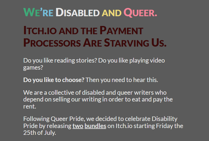E, claro, essa notícia do itch veio literalmente um dia antes do lançamento de dois bundles para comemorar o Mês das Pessoas com Deficiência. Eu participei dos bundles, enquanto pessoa com TDAH (mesmo que o Brasil não reconheça como deficiência, não dá pra negar que seja). A solução que a gente encontrou foi fazer um carrd com uma nota sobre a situação toda e divulgar o site em vez do link direto pro itch.